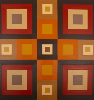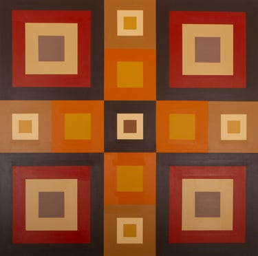 The geometry and musical vibrancy of urban life is examined in this abstract series (Urbis Harmonia/The Architecture of Stillness), in the rhythmical repetition of urban patterns, the dialogue of colours, and in the persistence of symmetry. The polychromatic palette is calm and earthy, while the hard edges soften, allowing the viewer to enter into a quiet meditative state. The works confront the dissonance and visual chaos of the contemporary urban experience. Ultimately the coherence of form and colour in reimagining urban dynamics, hints at a more utopian order.